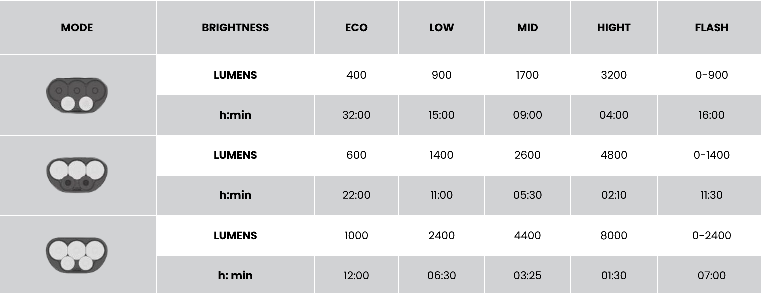 At the push of a button on the housing or remote control, it effortlessly switches between full, spot and floodlight mode. The top 3 LEDs show an amazing floodlight of 4800 lumens. The bottom row focuses the 3200 lumen beam. In combination, a perfect light field for every situation.